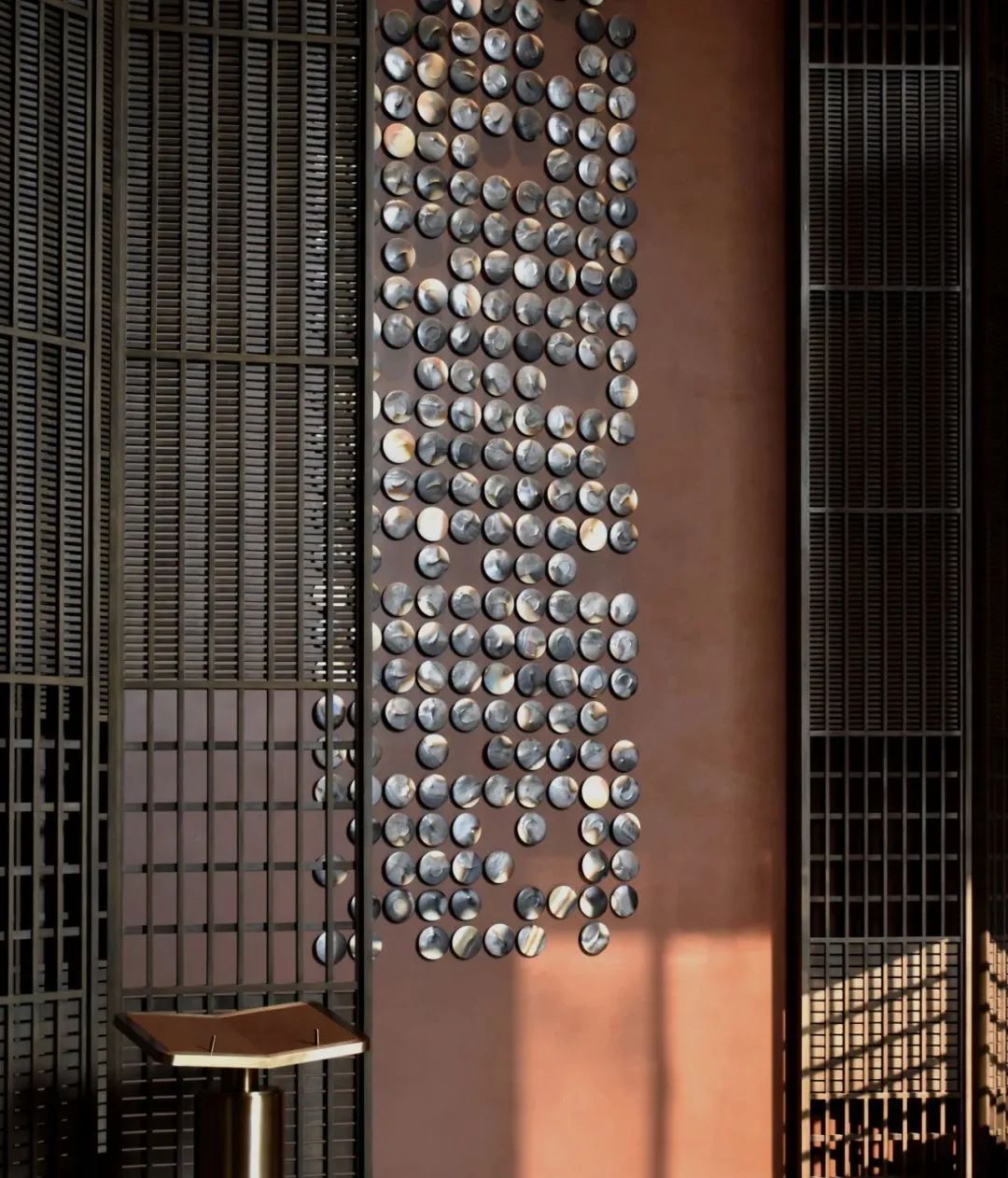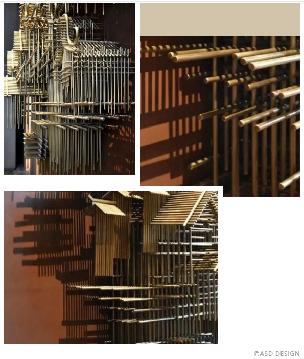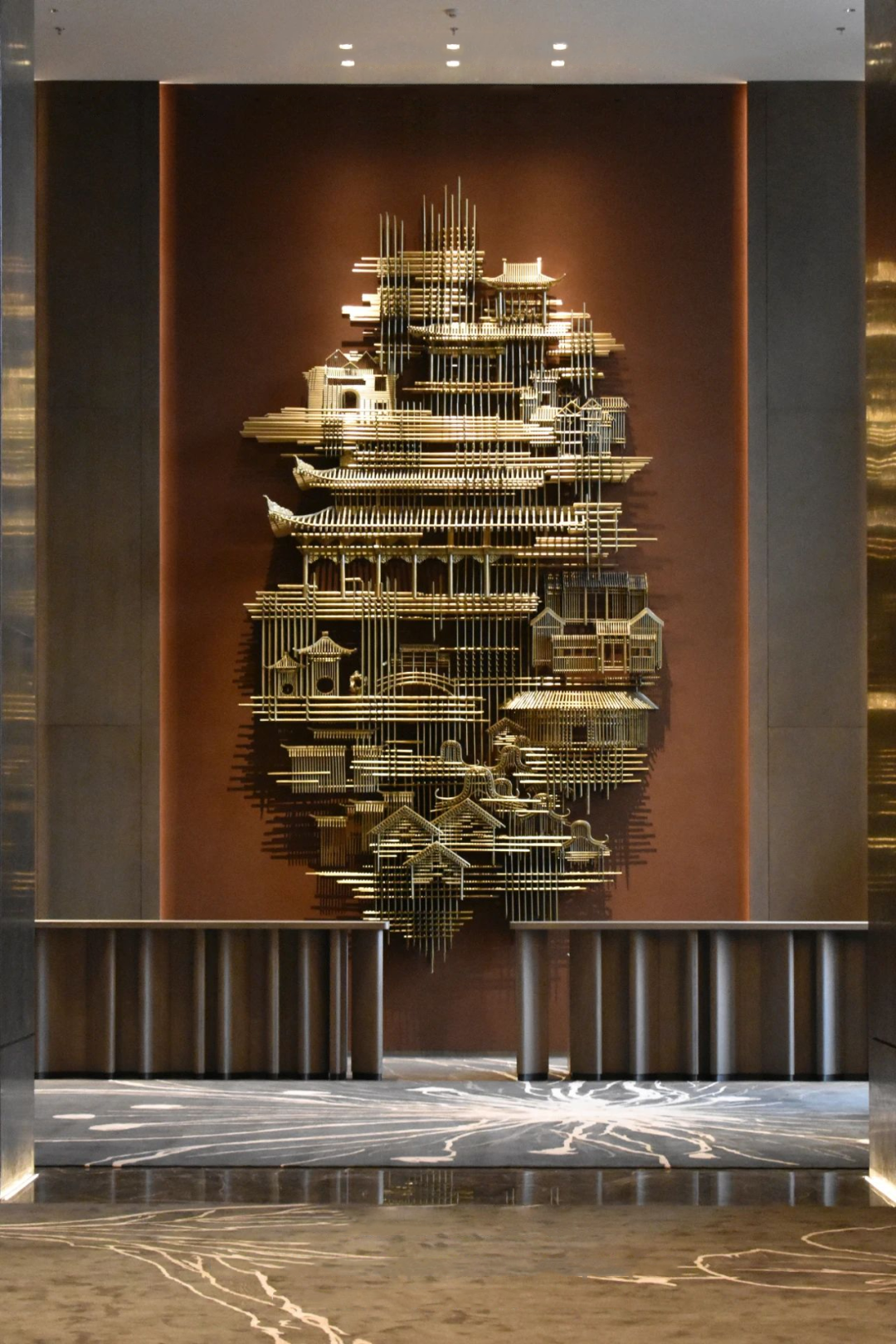 大堂背景雕塑“城韻”,取中國八大建筑派系精華集成,將傳統的古建筑元素以現代藝術手法進行重組,高高低低,錯落有致,講述著追夢人在此共同筑夢、追夢,搭建出城市的壯闊版圖。