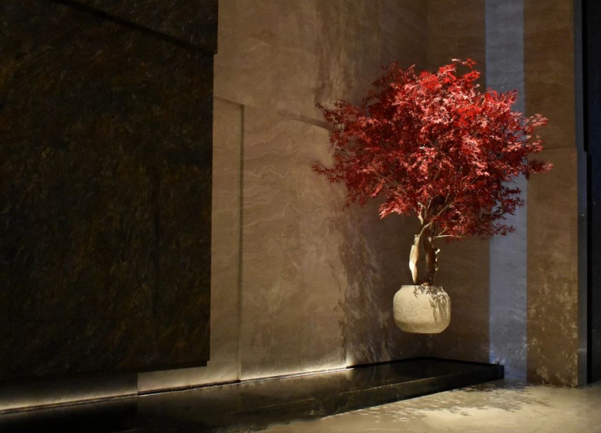 水景懸浮吊飾“熱情紅楓”與潺潺流水蜿蜒交織,展現漁村逐夢人如火如荼的熱情歲月。